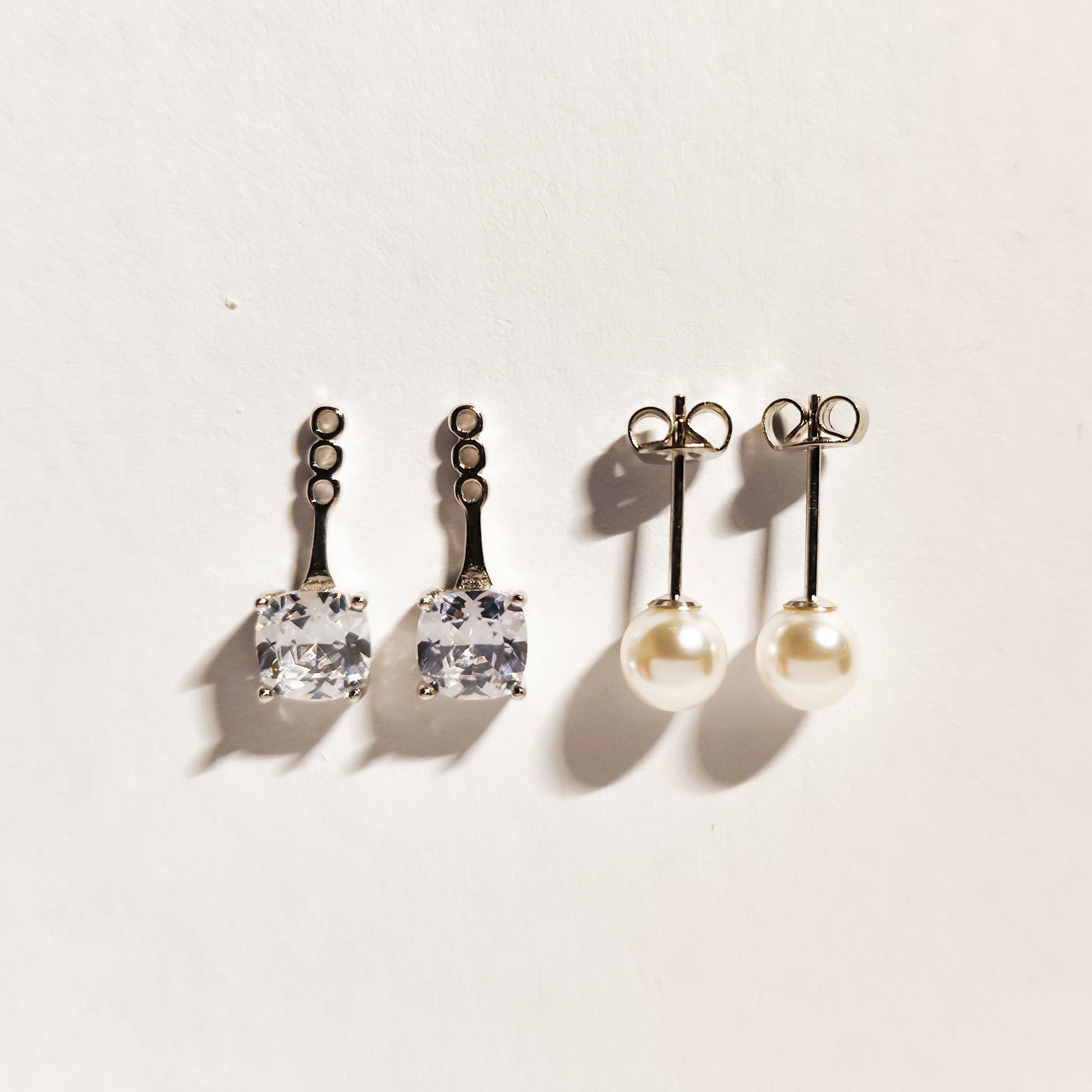 Versatility meets elegance in these 2-in-1 stud earrings, designed for the modern woman who values both timeless beauty and playful style. This unique set includes two interchangeable pairs—lustrous faux pearls and sparkling square-cut zirconia—crafted with a detachable bar design that allows you to wear them separately or together for a layered, sophisticated look.
