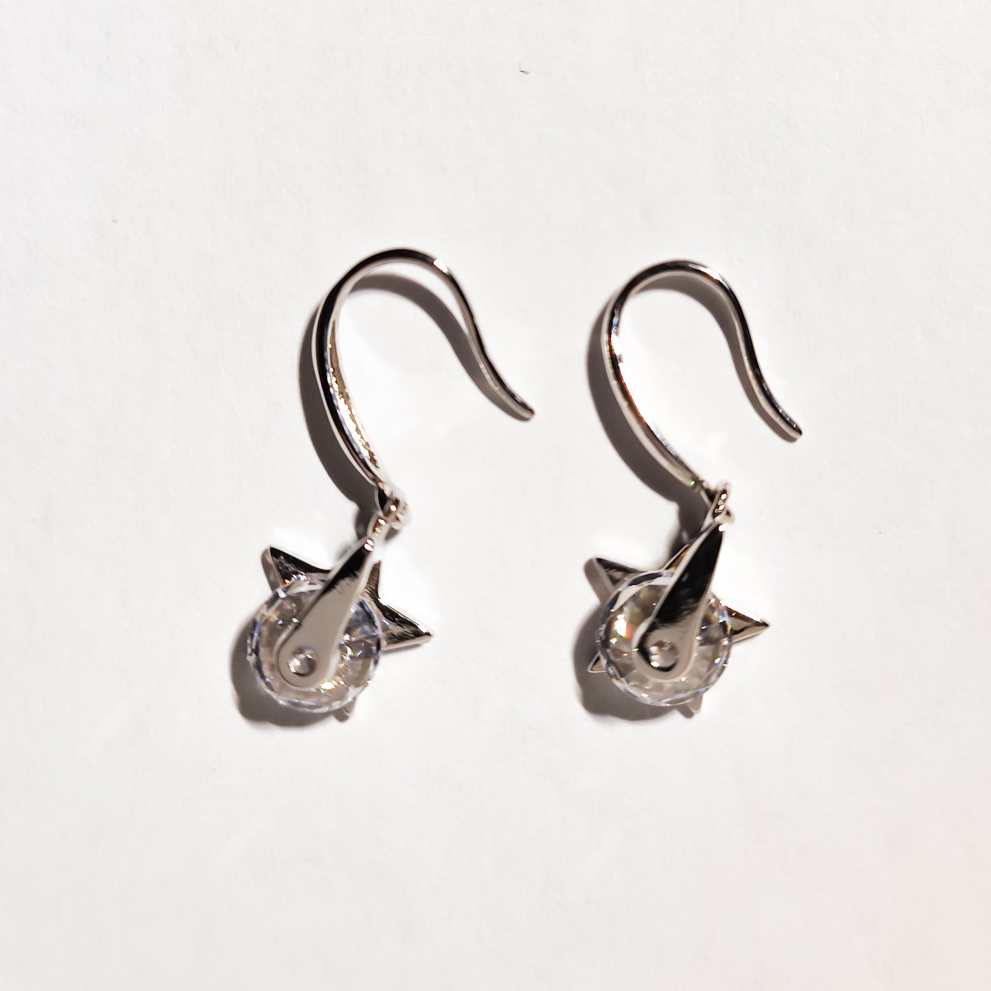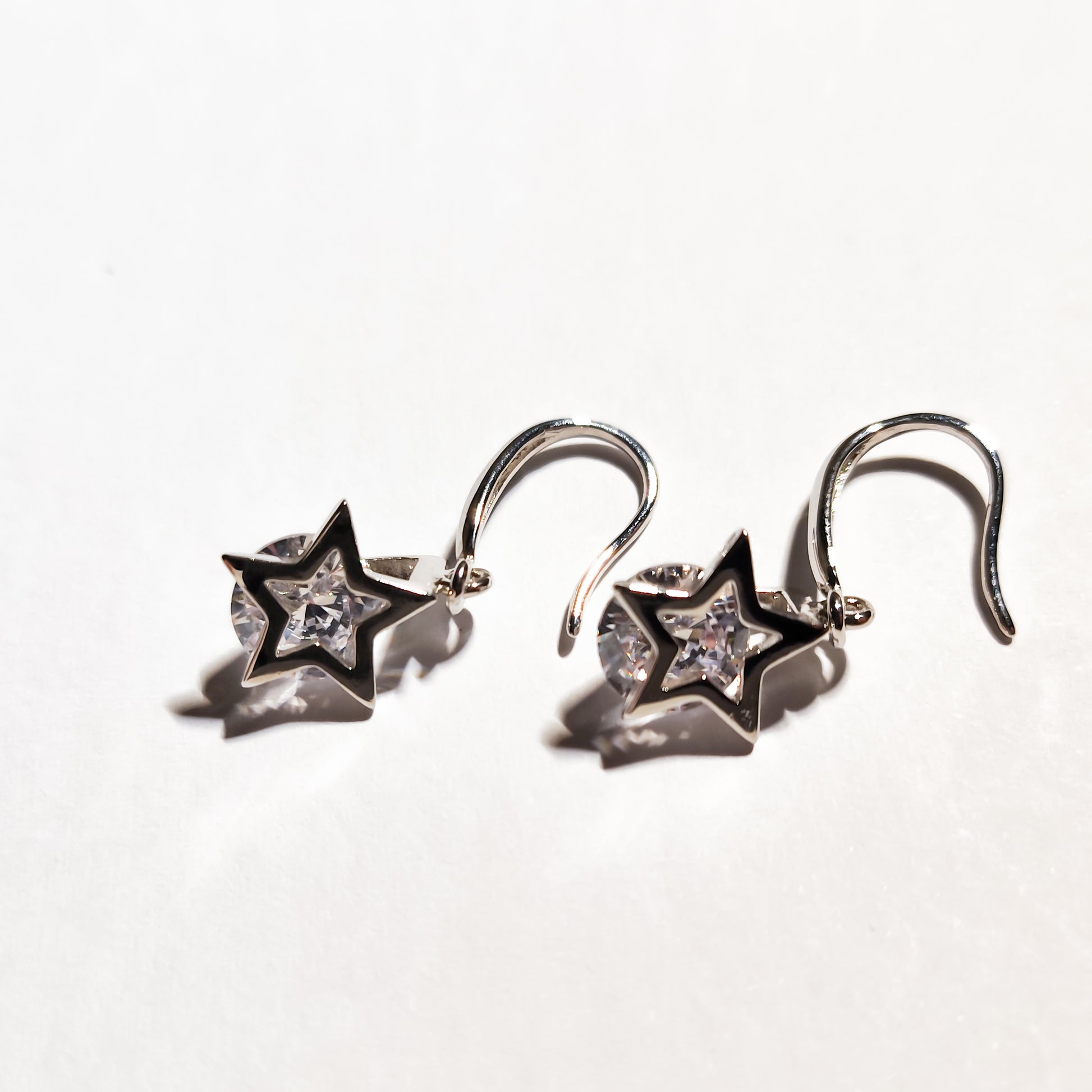 Bring a touch of celestial charm to your ensemble with these star-shaped drop earrings. Crafted with a polished sterling silver-tone finish, each earring features a hollow five-point star embracing a brilliant clear crystal at its centre. Designed to shimmer with every turn, these earrings add a playful yet refined accent to both casual outfits and evening looks.