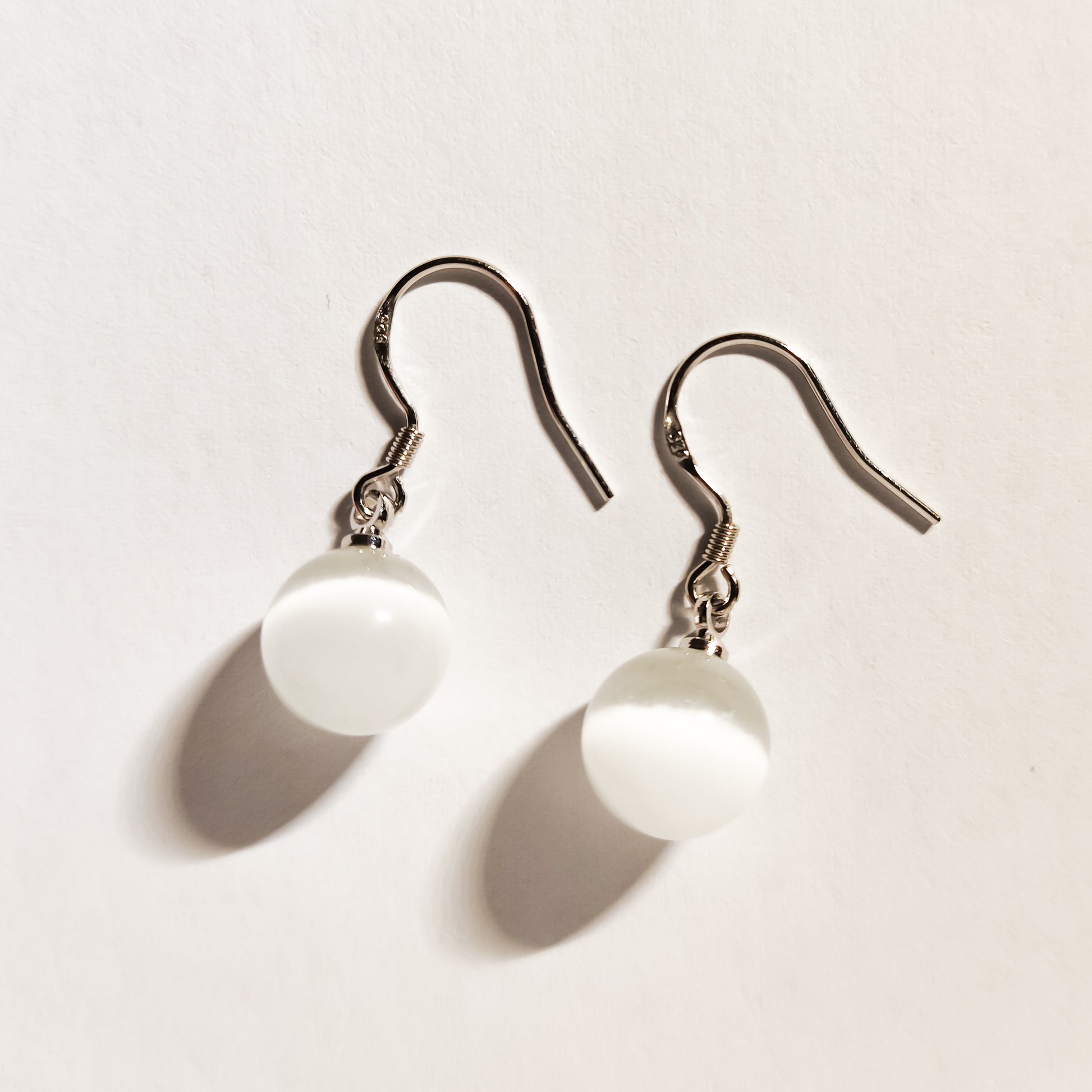 Clean, minimal and effortlessly refined — the White Cat’s Eye Sphere Earrings bring a luminous glow to your everyday style. Crafted with genuine white cat’s eye stone and paired with 925 sterling silver hooks, these earrings capture the beauty of simplicity with a gentle, ethereal sheen that catches the light from every angle.
